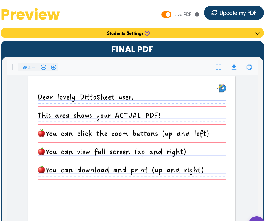 Before downloading your worksheet, you will want to preview it to ensure everything looks correct. DittoSheets provides a live preview that updates as you make changes.
